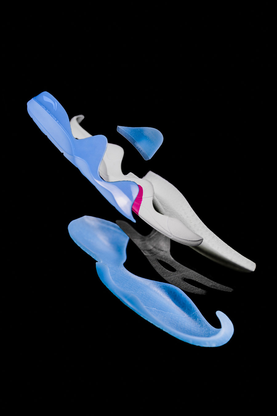 不同于一般球鞋,韦德之道 8 中底的侧向支撑有两层,内层白色部分为发泡材质,外层蓝色部分则为有弹性的橡胶。