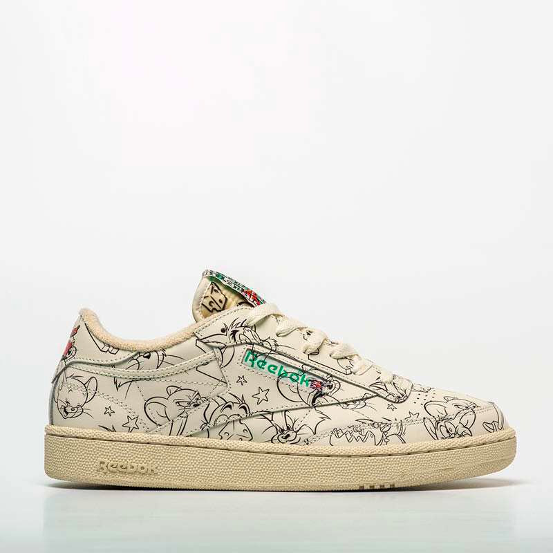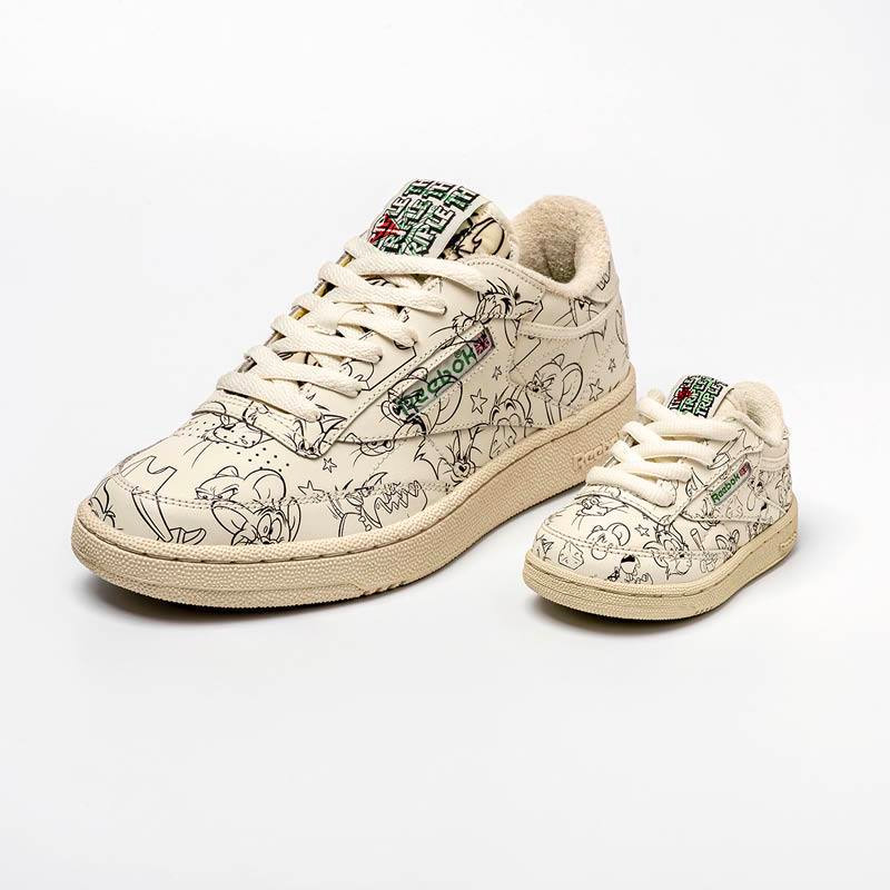 另外还有三款不同配色的 Reebok Club C,基于经典的百搭鞋型,分别以 Jerry 鼠配色、动画手稿和米白配色呈现。
