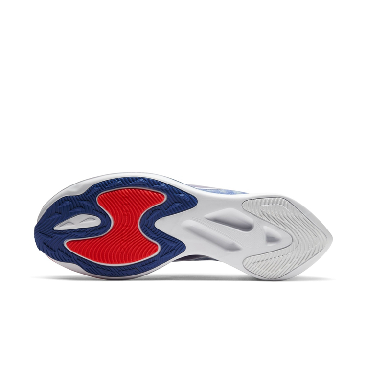 中底前掌部分点缀红色细节,与后掌蓝色部分中间采用渐变过渡设计。前掌搭载 Zoom Air 气垫,为穿着带来充分的回弹与反馈。