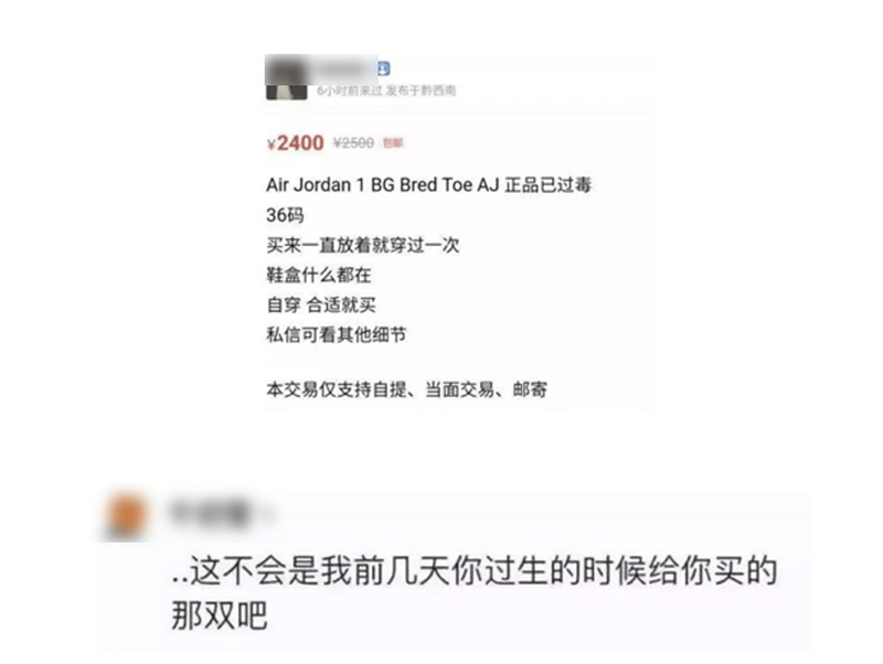 无独有偶,在球鞋圈,某位 SneakerHead 送给心仪女生一双黑红脚趾 Air Jordan 1,女生收到后转手挂上闲鱼。