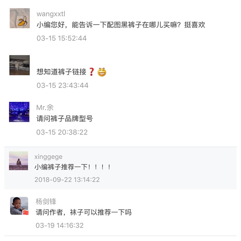 除了诸如 “猪油扣碎”、“紫加哥”、“芝加弟” 等脑洞大开的球鞋外号,「求裤子链接」 绝对是每篇内容留言中,雷打不动的必见回复!