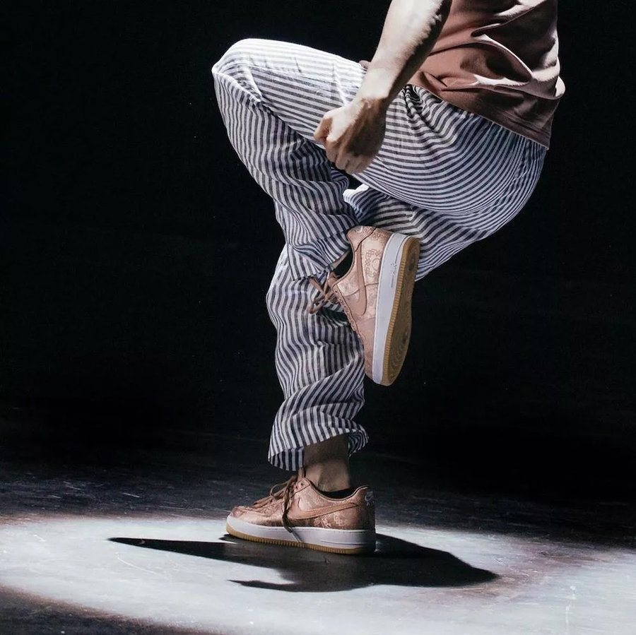 在玫瑰金丝绸 CLOT x Air Force 1 多次曝光实物,冠希和秦舒培都上脚后,昨天终于轮到了 “叶师傅” 甄子丹的上脚。