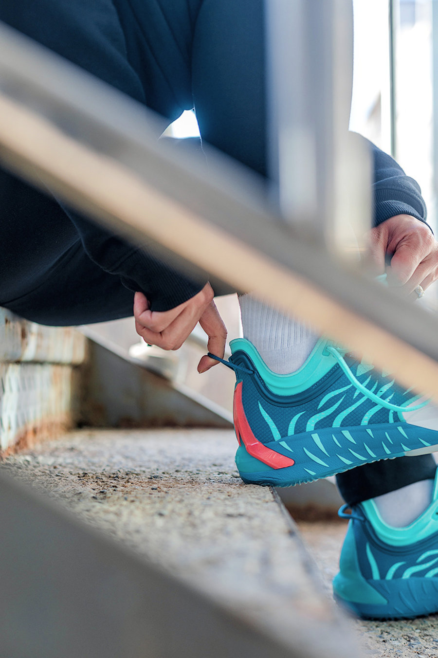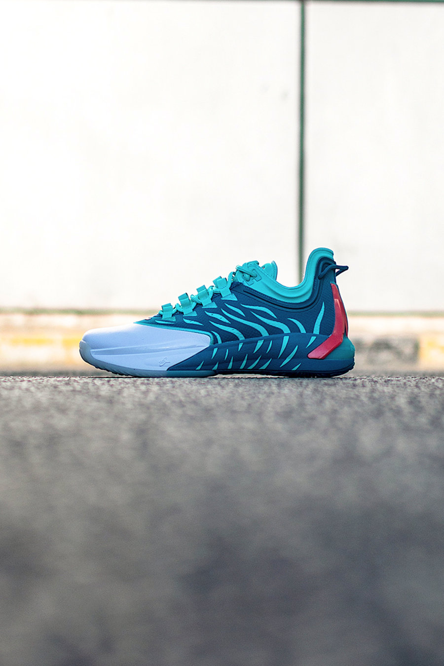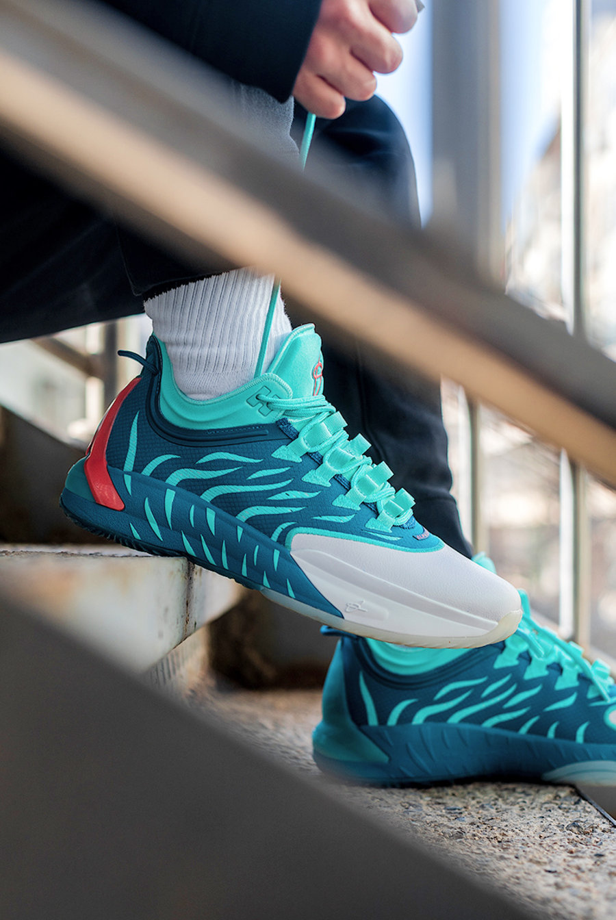 虎爪纹理的外底设计,更是在前掌位置以虎掌造型呈现。乳白色与孔雀蓝色的撞色效果,也为颜值加了不少分。