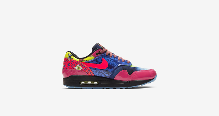 整双鞋沿袭 Air Max 1 经典造型,鞋身采用粉红漆皮环绕,细节则采用黄、蓝撞色示人。