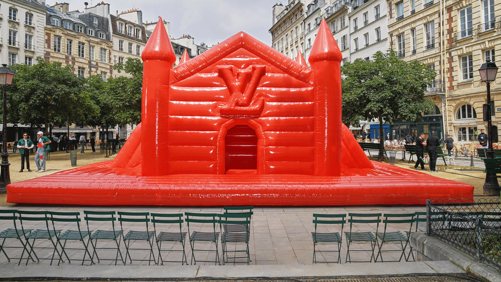 由鲜花组成的大型 LV Logo 置于场地中央,熟悉的公园长椅,红色气球,最大程度地还原了秀场童年氛围。