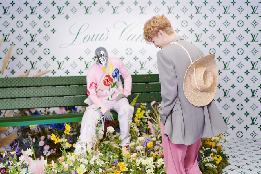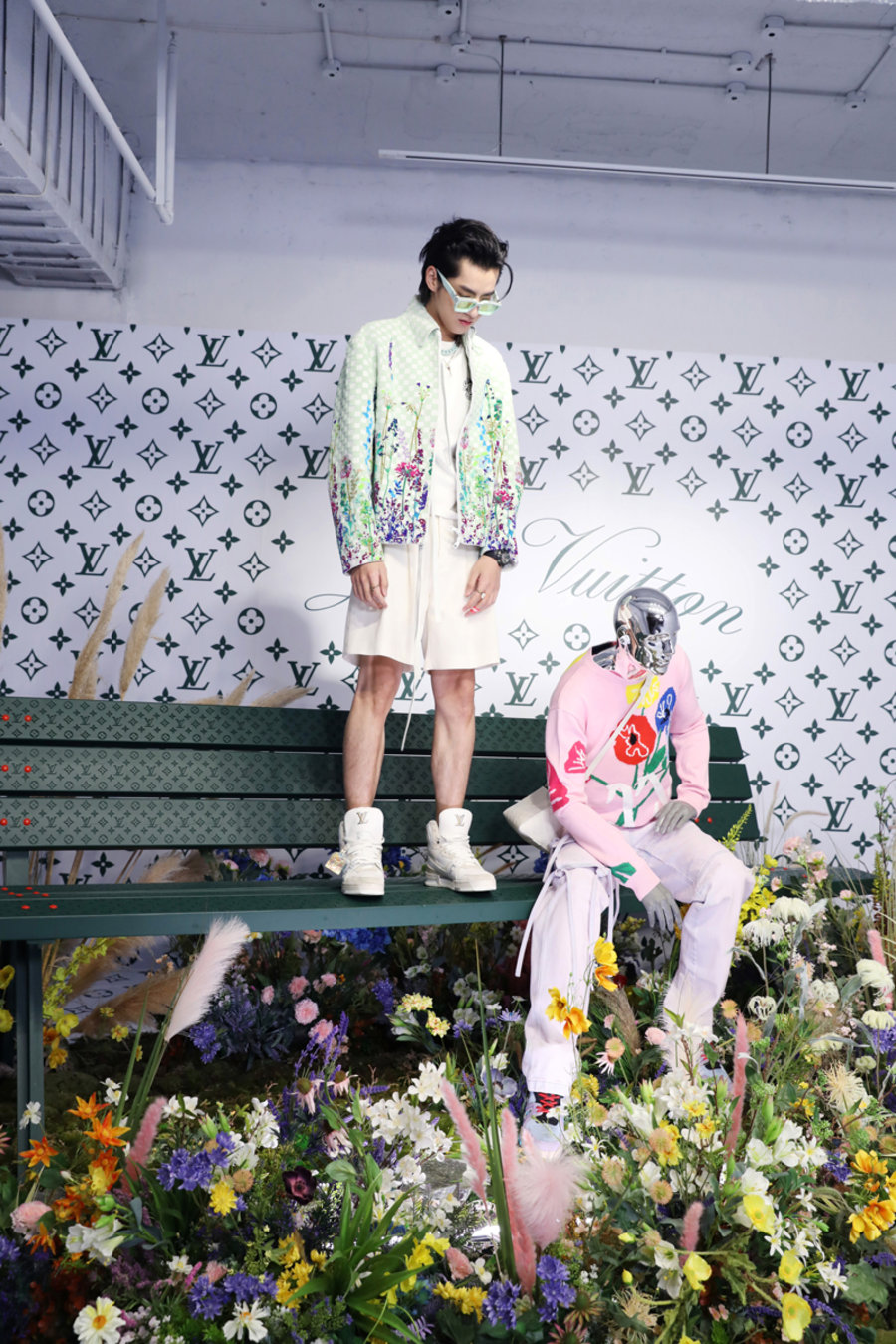 活动场地的设计灵感就是来自 2020 春夏男装秀场,墙面和地面布满绿色的经典 Monogram 图纹,营造出生机盎然的氛围。