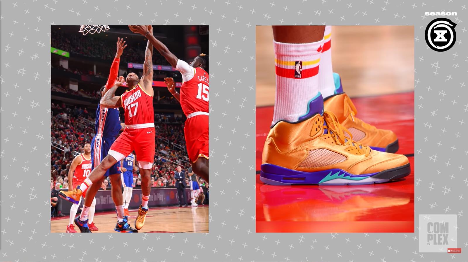 而后 Jordan Brand 还为他打造了「新鲜王子」配色 Air Jordan 5 以及亲友版本,鞋王 P.J. 塔克还在比赛中上脚。