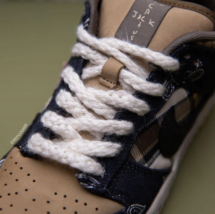 最上端的鞋带孔旁加入衣扣点缀,这种小细节往往格外圈粉,鞋带使用白色的麻绳装扮,尽显 Travis Scott 本人的牛仔气质。