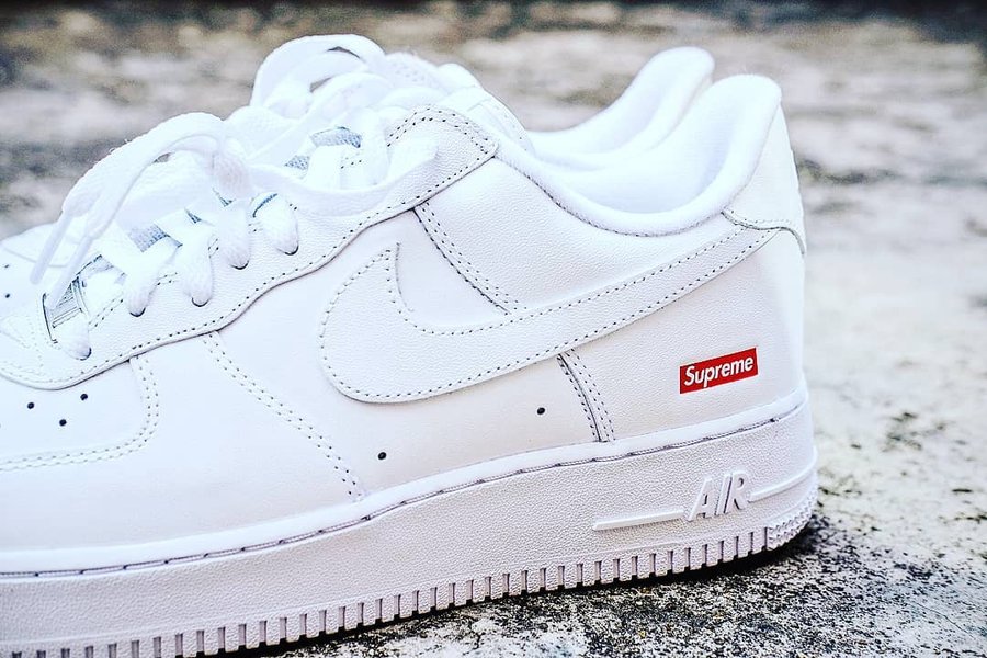 纯白 Air Force 1 在后跟点缀招牌红色 Supreme Box Logo,很能体现 Supreme 联名鞋款的风格。