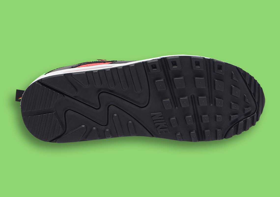 黑、白色为主色调的 Air Max 90,辅以大热色荧光绿点缀,同时粉色车线勾勒的 Swoosh,同样是日常穿搭中的吸睛利器。