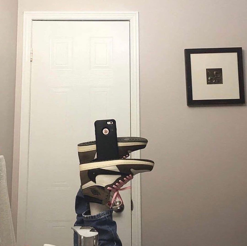最近全网都流行脚蹬手机拍照的晒鞋方式,Travis Scott 也玩了一把,脚上穿的则是最具代表性的反勾 Air Jordan 1.