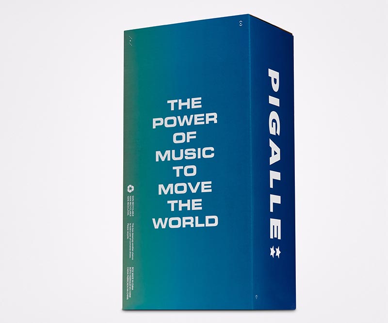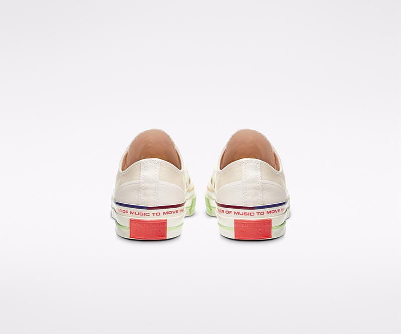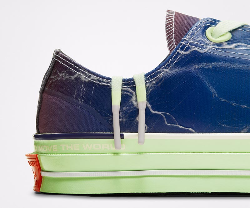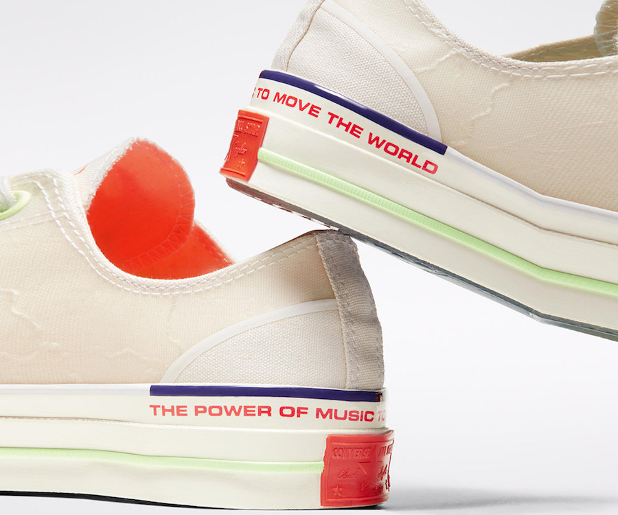 均在帆布鞋身上覆盖一层特殊薄膜,营造出类似闪电的特殊质感。后跟点缀有 “THE POWER OF MUSIC TO MOVE THE WORLD” 字样,表达出「音乐推动世界前进」的理念。