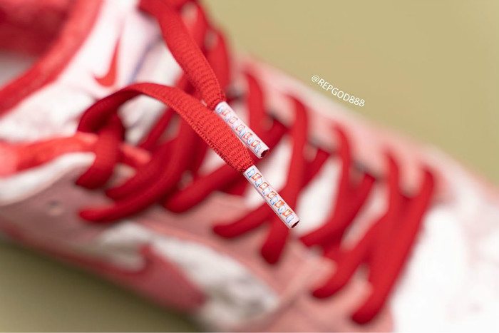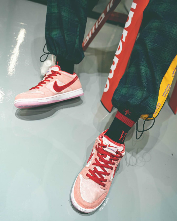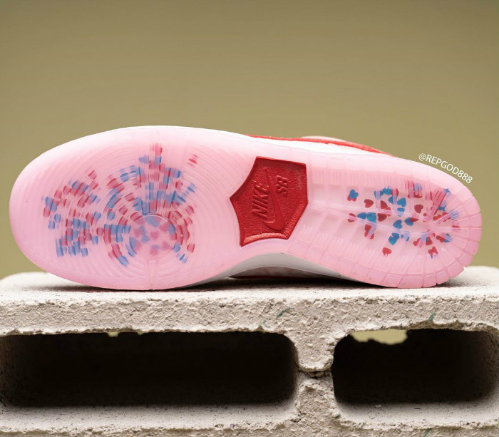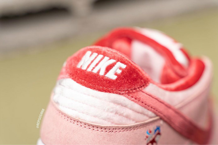鞋身采用浅粉翻毛皮搭配白丝绒共同呈现,鞋侧 Swoosh 与内衬则选用鲜艳的红丝绒衬托,营造出甜美细腻的「情人节」气氛!