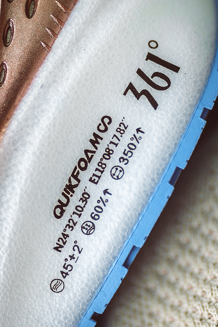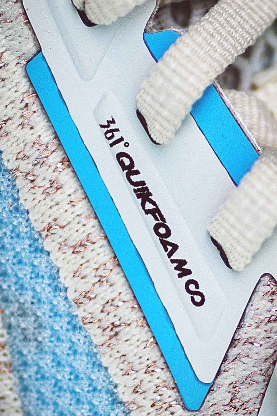 鞋带孔采用热熔科技打造,能够带来更加稳定的效果,同时点缀「361°」与「QU!KFOAM ∞」字样。