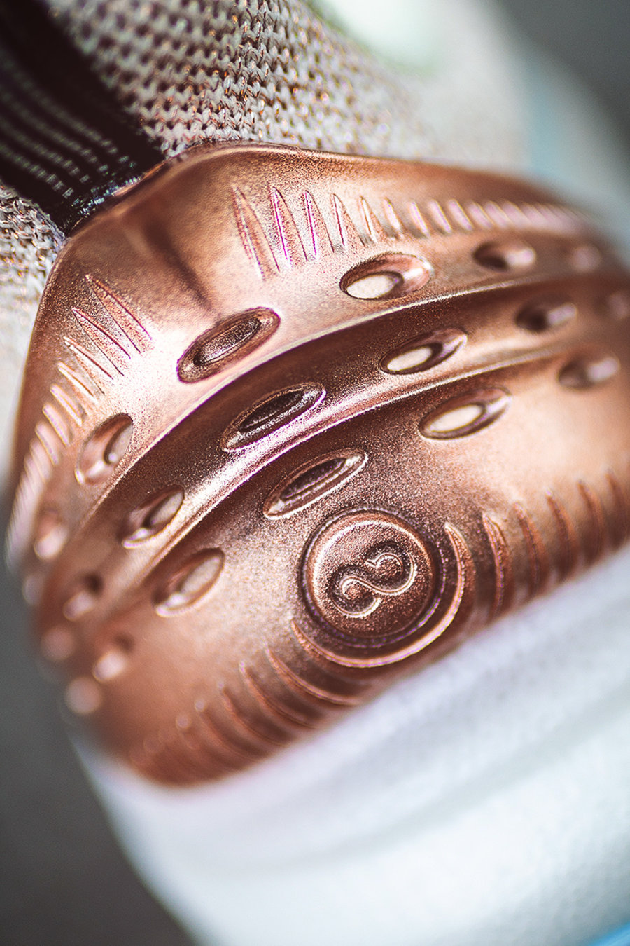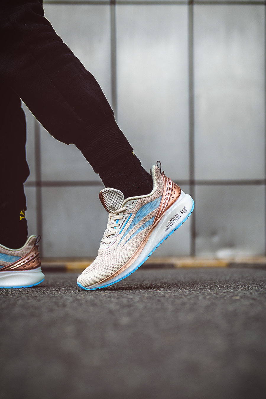 Q 弹超跑鞋后跟搭配大面积 TPU 环绕,将后跟牢牢的包裹起来,同时玫瑰金色金属质感涂层也为整双鞋带来铜器般的视觉效果。