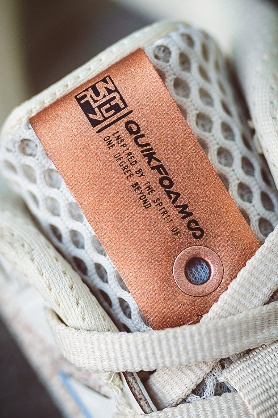玫瑰金色鞋舌标签在色调上与整双鞋保持一致,同样印有「QU!KFOAM ∞」字样彰显鞋身科技。