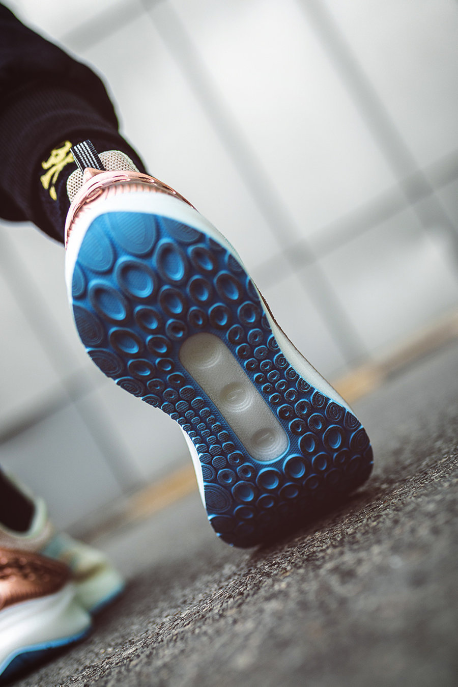 后跟玫瑰金色 TPU 采用镂空式设计,不仅极具设计感,同时中间位置还点缀有「∞」图案,呼应鞋款本身。