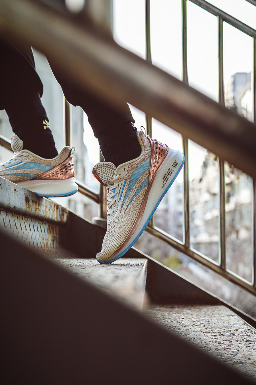 卡其色主调下若隐若现的玫瑰金色彩,与侧身的淡蓝色 MONO 纱材质带来极为清新的视觉效果。上脚之后无论是跑步使用还是日常穿着,都能带来不俗的搭配效果。