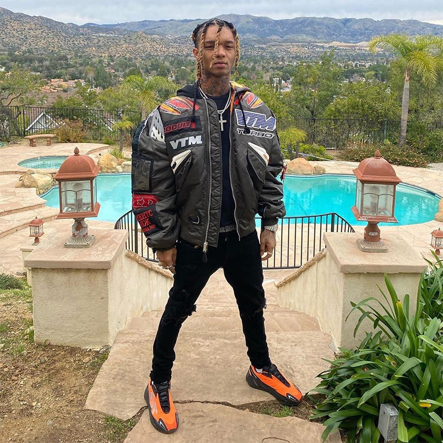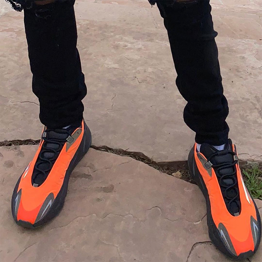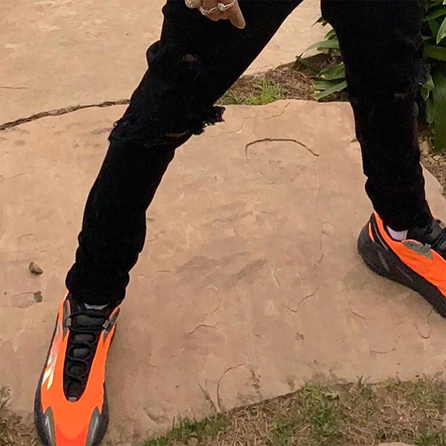 上脚图片大家已经看得不少了,除了 Kanye West 在早期的亲着上脚,说唱歌手 Swae Lee 也在近期带来橘红配色的上脚,让我们可以提前感受这双鞋的魅力。