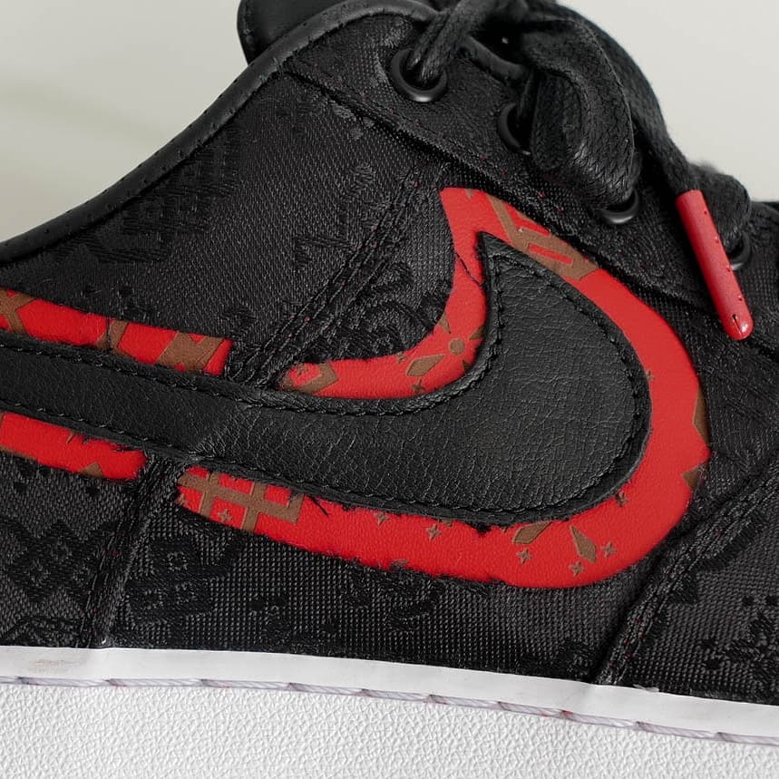 在他的 Instagram 上还有另外一个 DIY 作品,在原有 Swoosh 的周边,剪出红色的边缘,也让这双原本低调内敛的黑丝绸,更具个性。