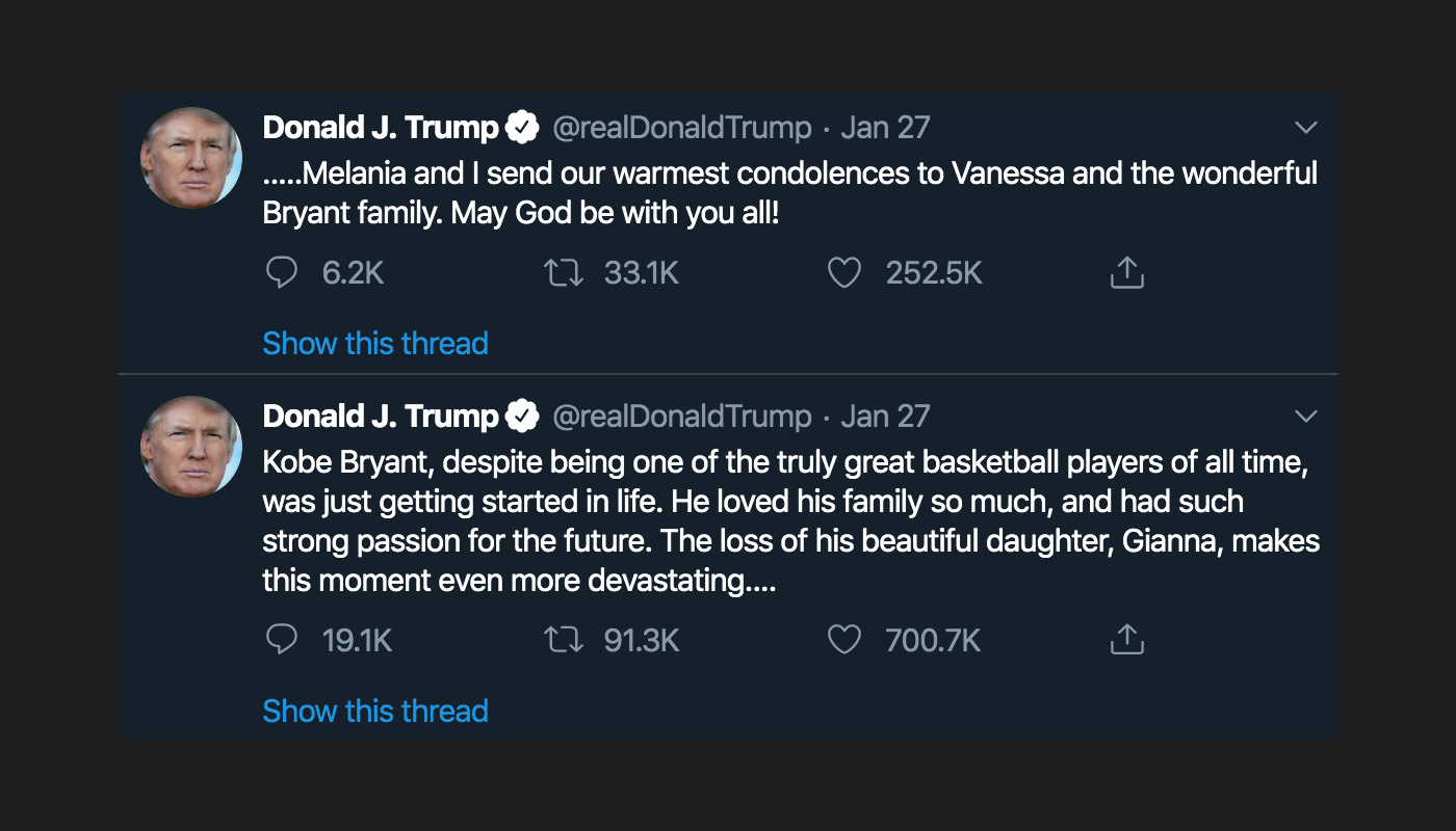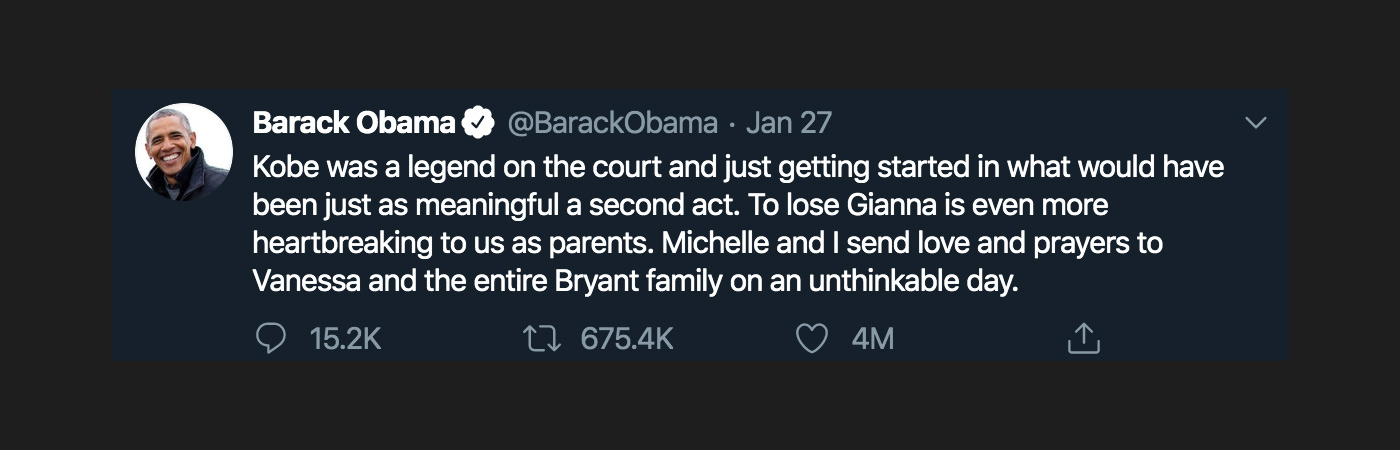 美国现任总统特朗普和前任总统奥巴马发推,表达对于科比的悼念。