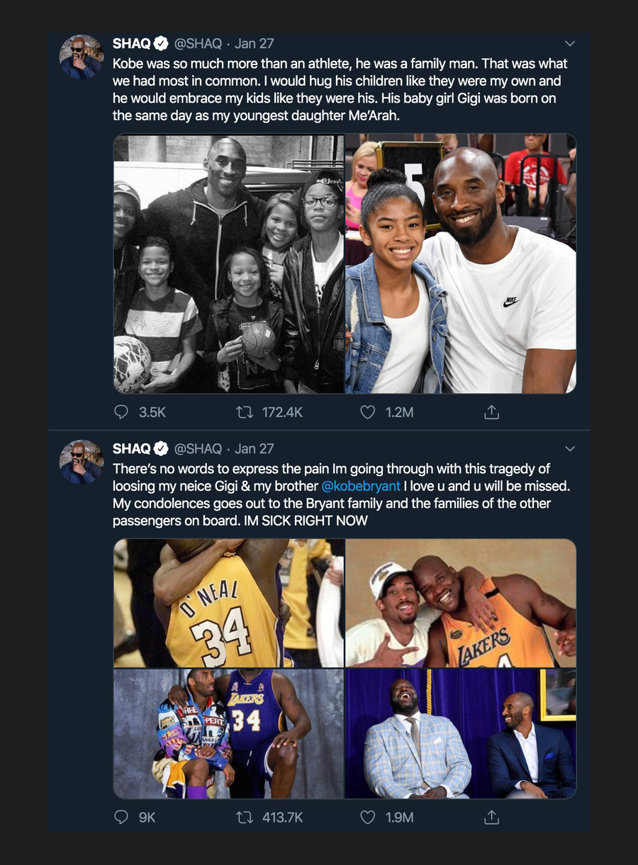 作为「O.K. 组合」之一的奥尼尔与科比情同手足,是与科比并肩奋斗的战友,他的字里行间透露出无法抑制的悲伤。