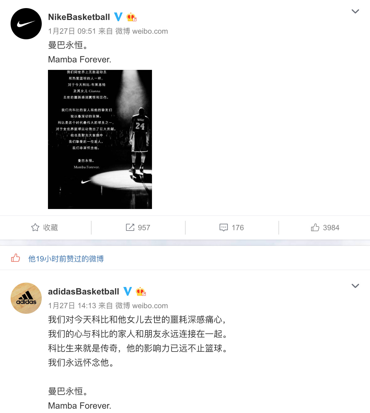 Nike Basketball 微博官方账号和 adidas Basketball 微博官方账号都表达了对于科比的深切怀念和哀悼,并互相点赞。