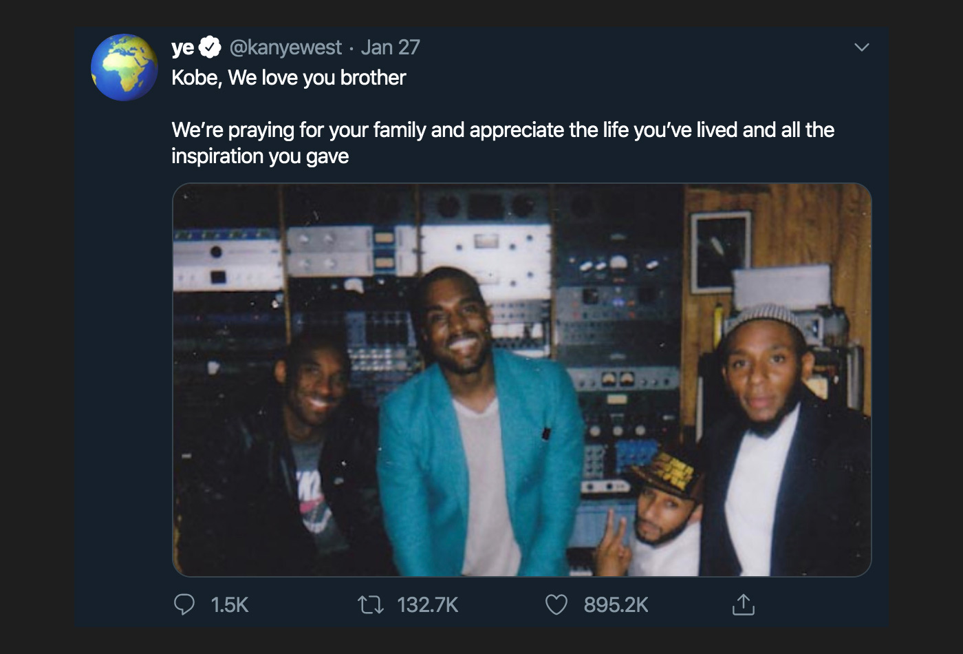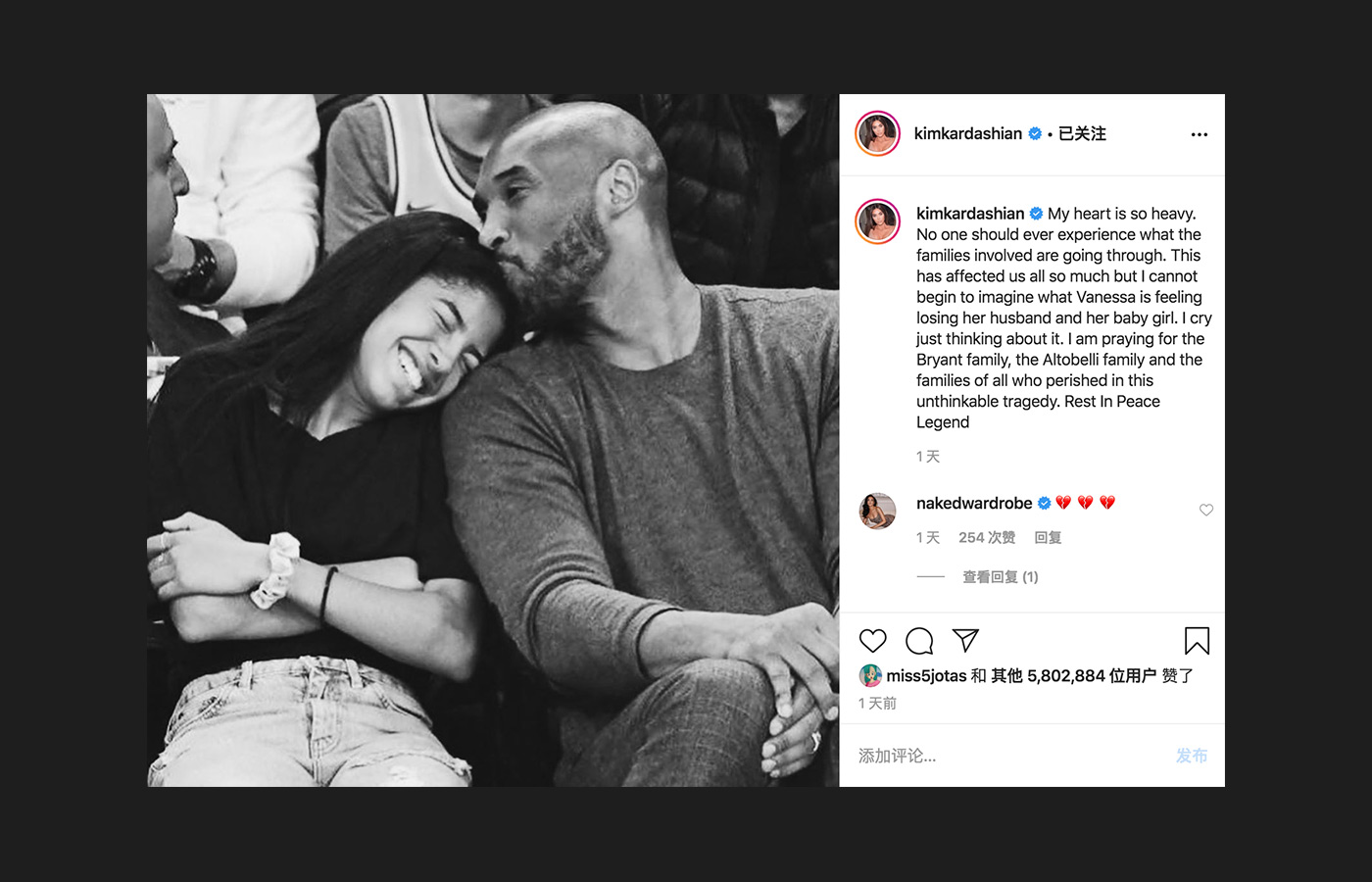Kanye West 和 Kim Kardashian 都通过社交网络发布了对于科比的悼念。