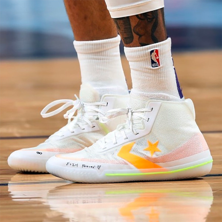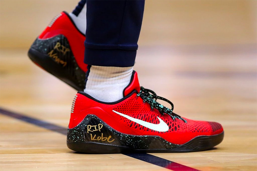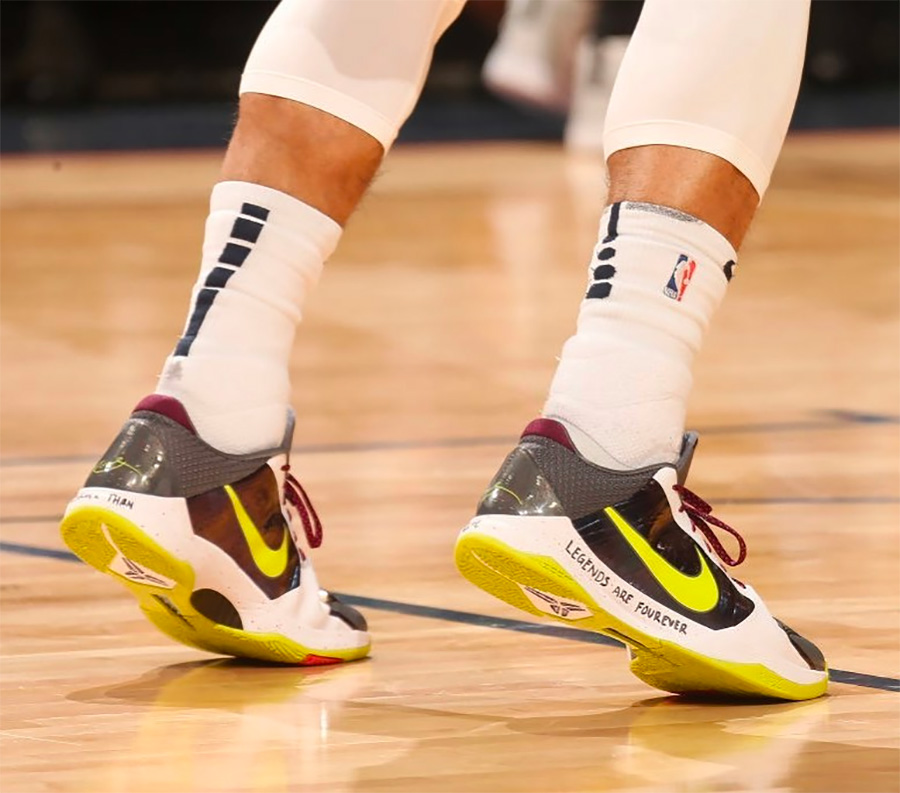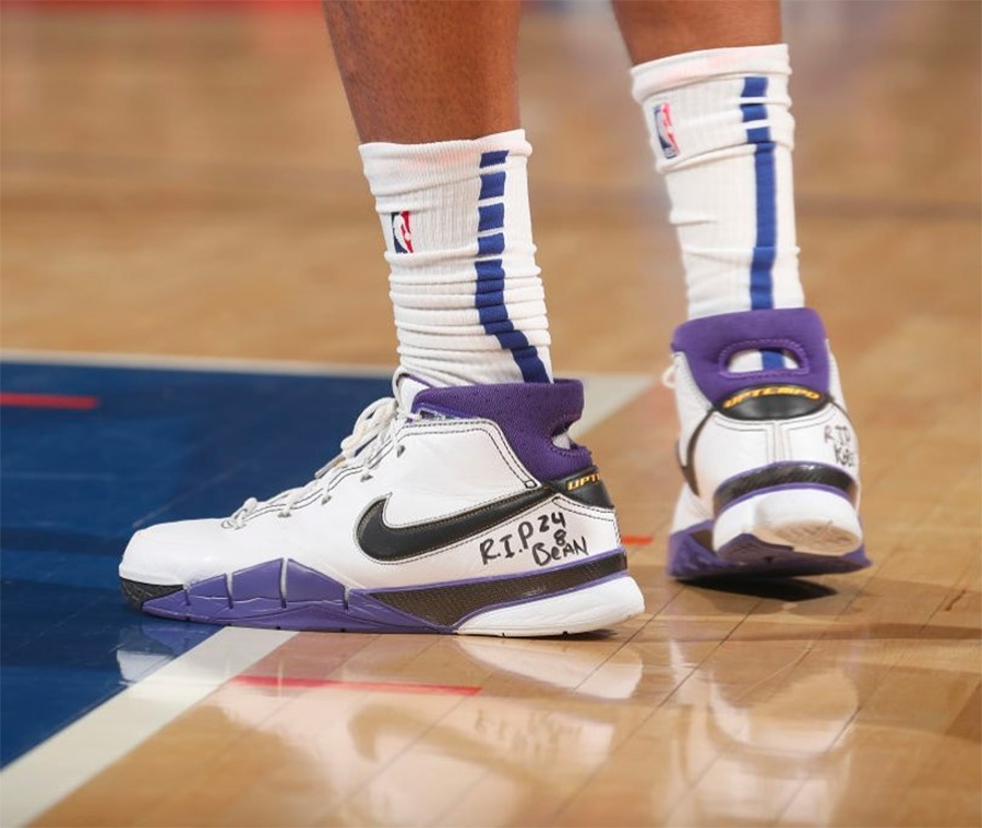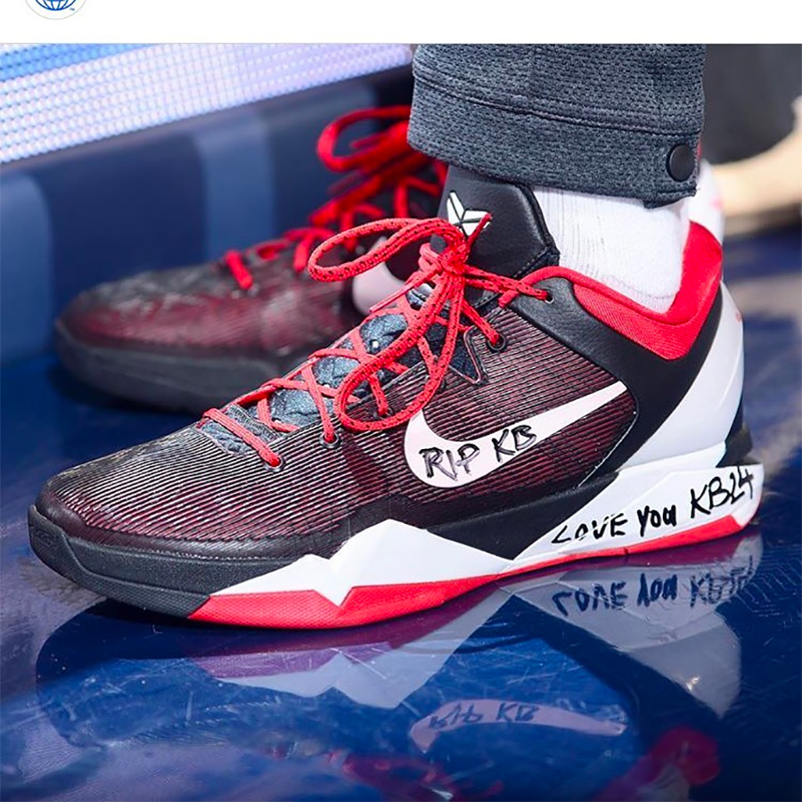 在 NBA 赛场,球员们以 Kobe 战靴和在球鞋上书写悼念文字,表达哀思。