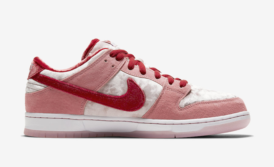 这双 StrangeLove x Nike SB Dunk Low 由著名艺术家 Sean Cliver 和 Todd Bratrud 操刀设计,淡粉鞋身辅以鲜红 Swoosh,甜蜜的氛围让人倍感轻松。