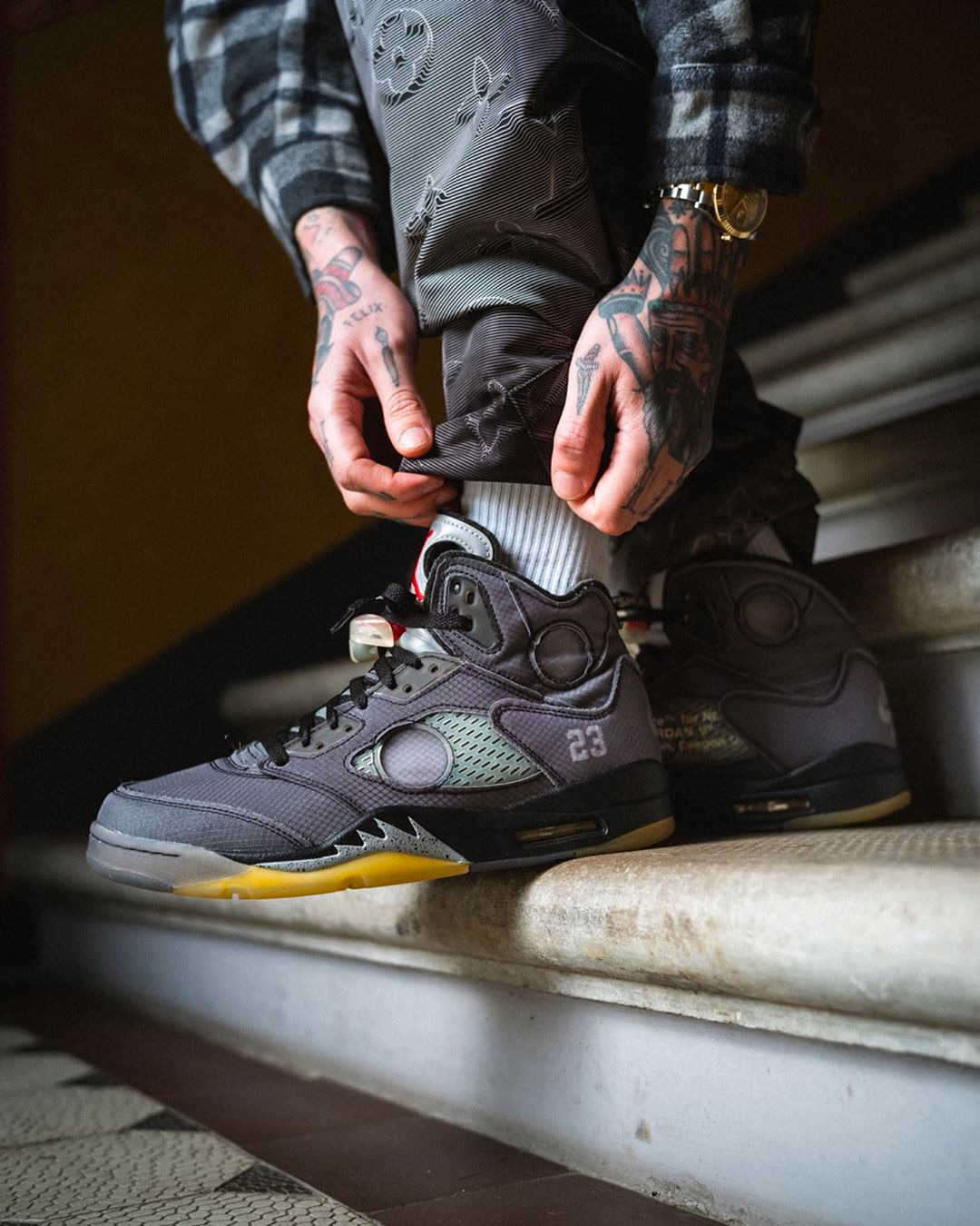 OFF-WHITE x Air Jordan 5 以五代鞋型最为经典的黑银配色为灵感出发点,不仅承袭了 THE TEN 系列的解构思维,半透明材质的创新应用,则是这双鞋最大的亮点。