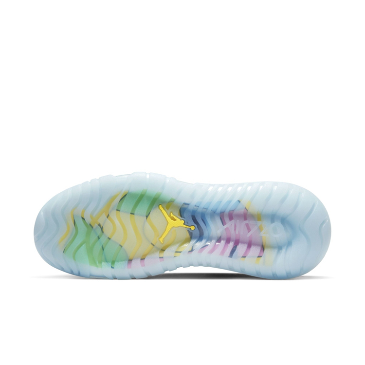 搭配淡蓝色全掌气垫与同色半透明水晶外底,完善整双鞋的设计,同时透过水晶外底与气垫还可看到鞋底的彩色印花,可以说在设计上相当走心。
