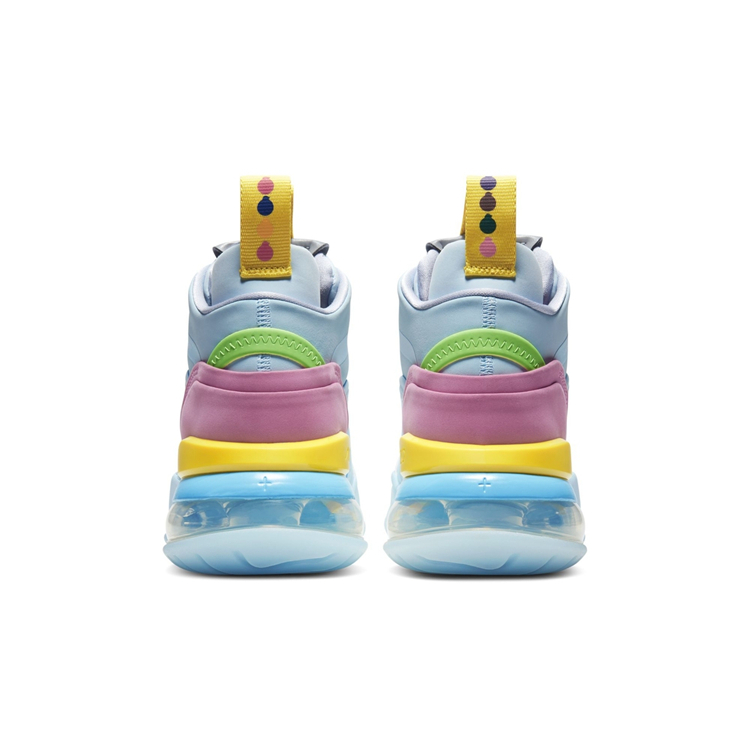 整双鞋采用淡蓝色为主调,后跟位置点缀黄色、粉色以及绿色点缀。