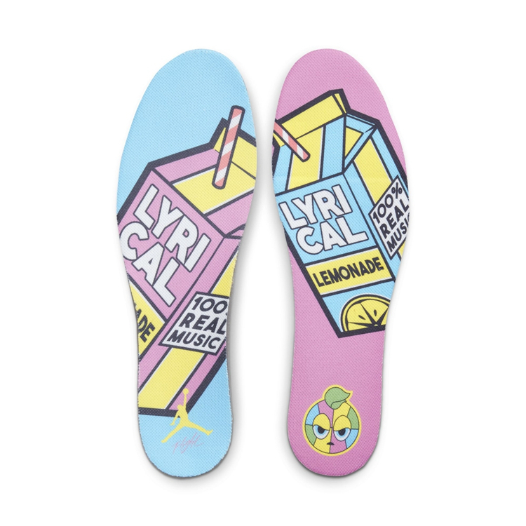 鞋垫设计也是颇为走心,不对称鸳鸯设计,涵盖 Lyrical Lemonade Logo 与 Jumpman Logo 等元素。