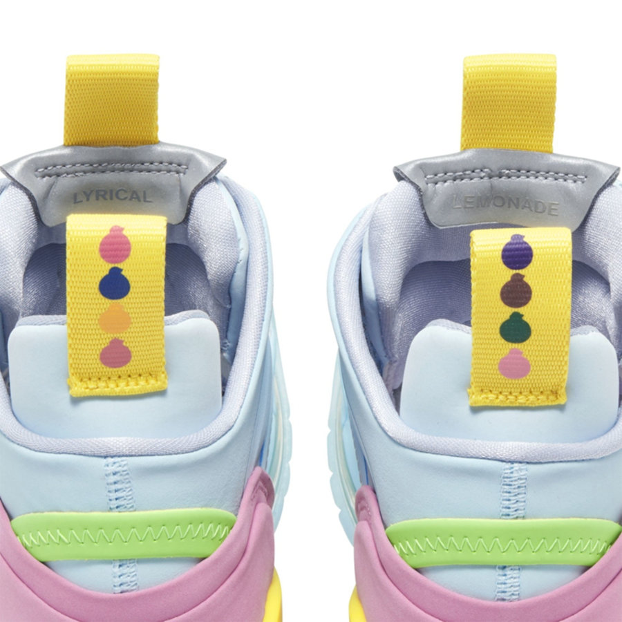 最大亮点当属鞋身上的细节刻画,其中左右脚鞋舌上点缀 Lyrical Lemonade Logo 与卡通人物造型图案。