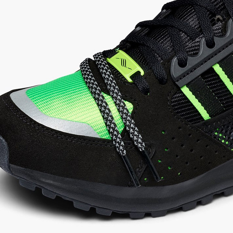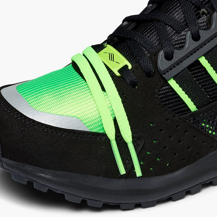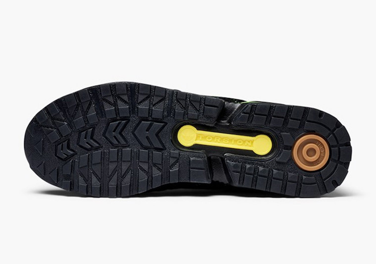 全新配色采用黑色为主调,搭配大面积荧光绿色,带来极为亮眼的视觉效果。鞋身材质涵盖麂皮以及网眼材质,极大程度的展现复古气质。
