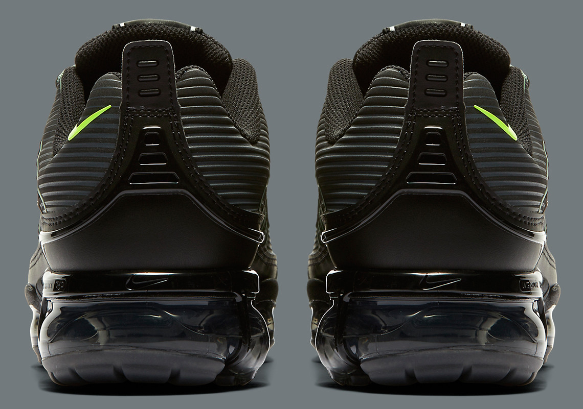这双鞋以黑色为主基调,鞋身为 Air Max 360 的造型,中底为 Air Vapormax 的风格。