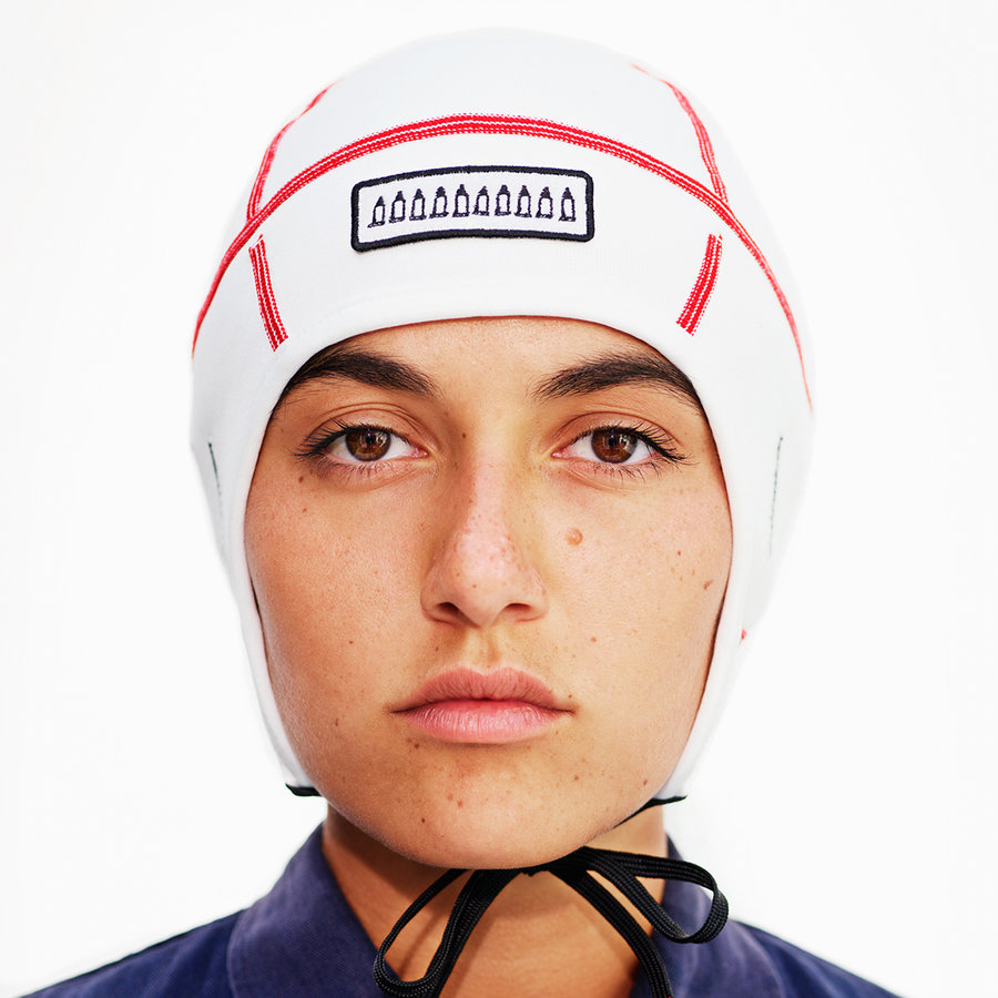 同时双还准备了一款极具个性的冷帽,纯白色的装扮,辅以红线点缀,代表 TomSachs 的 Ten Bullets 细节十分讨巧。