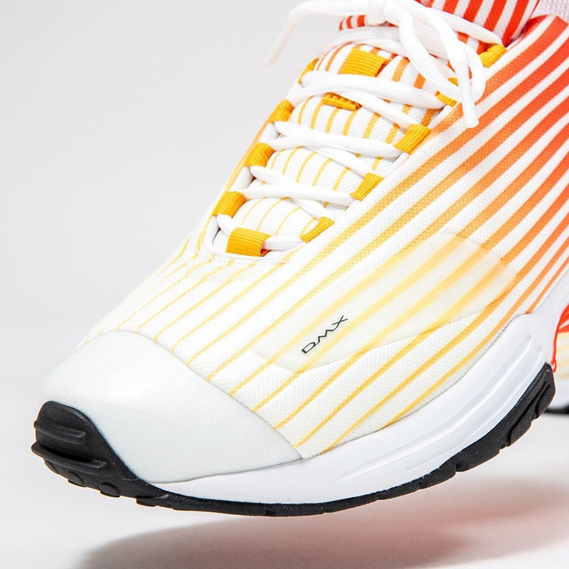 标志性的发散状橘红色渐变条纹,营造非凡的速度感,让人过目不忘!透明的鞋面 TPU 补强,既美观又提供充分的鞋面支撑,搭配内置 DMX 缓震科技,相信让不少 OG 玩家都念念不忘!