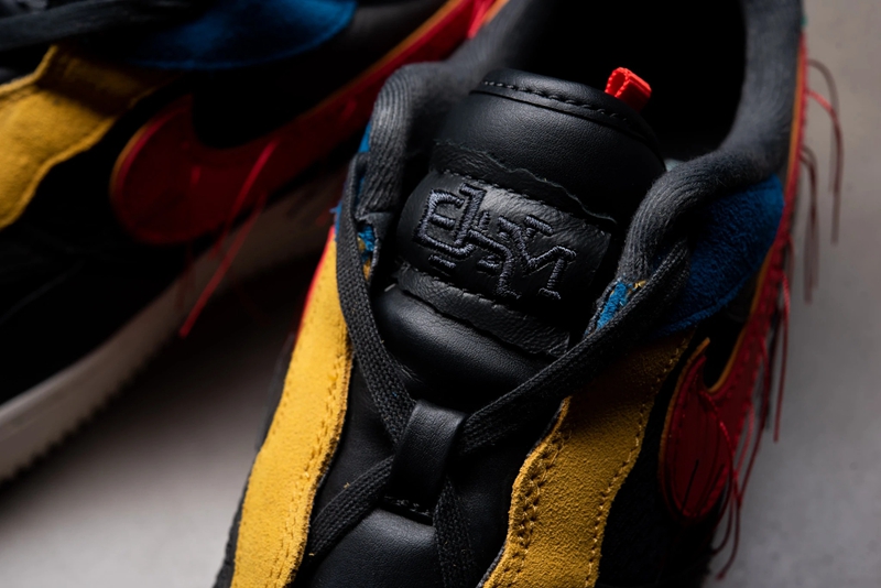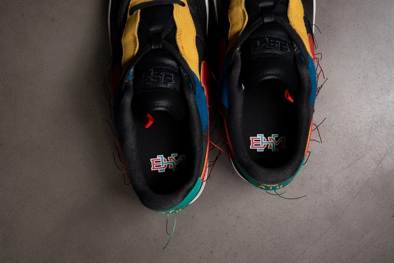 这双鞋以黑色为基调,搭配黄、蓝、绿、红 4 中 BHM 惯用颜色点缀。