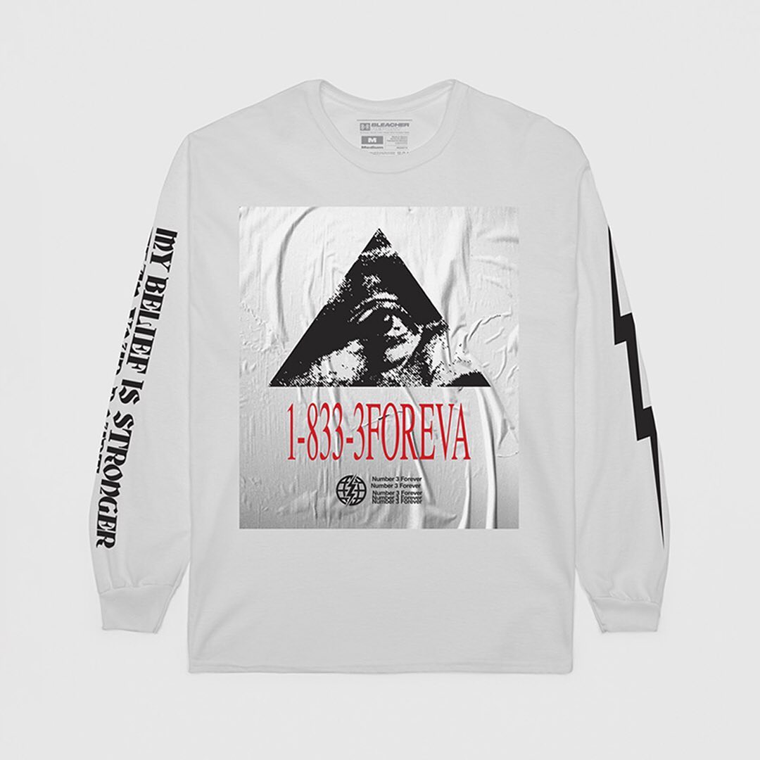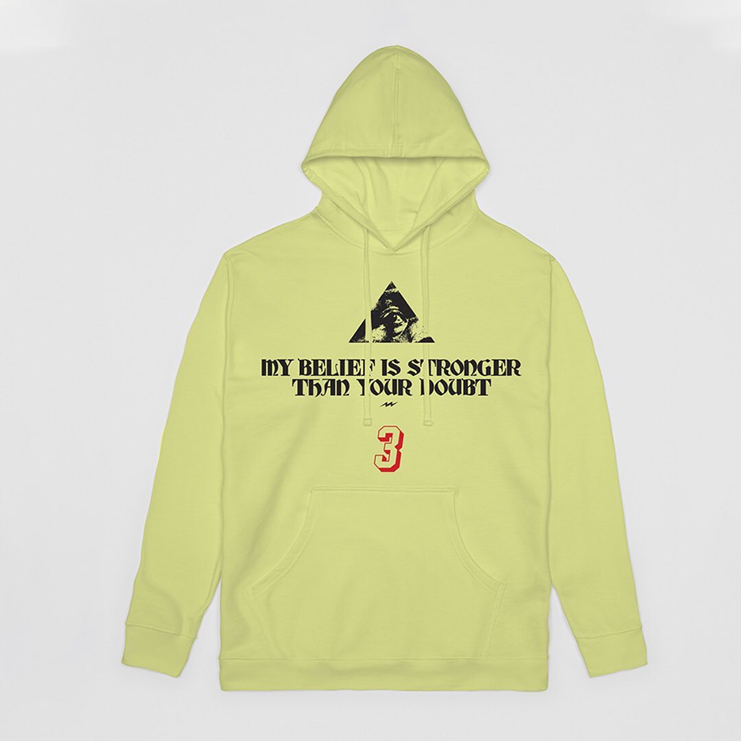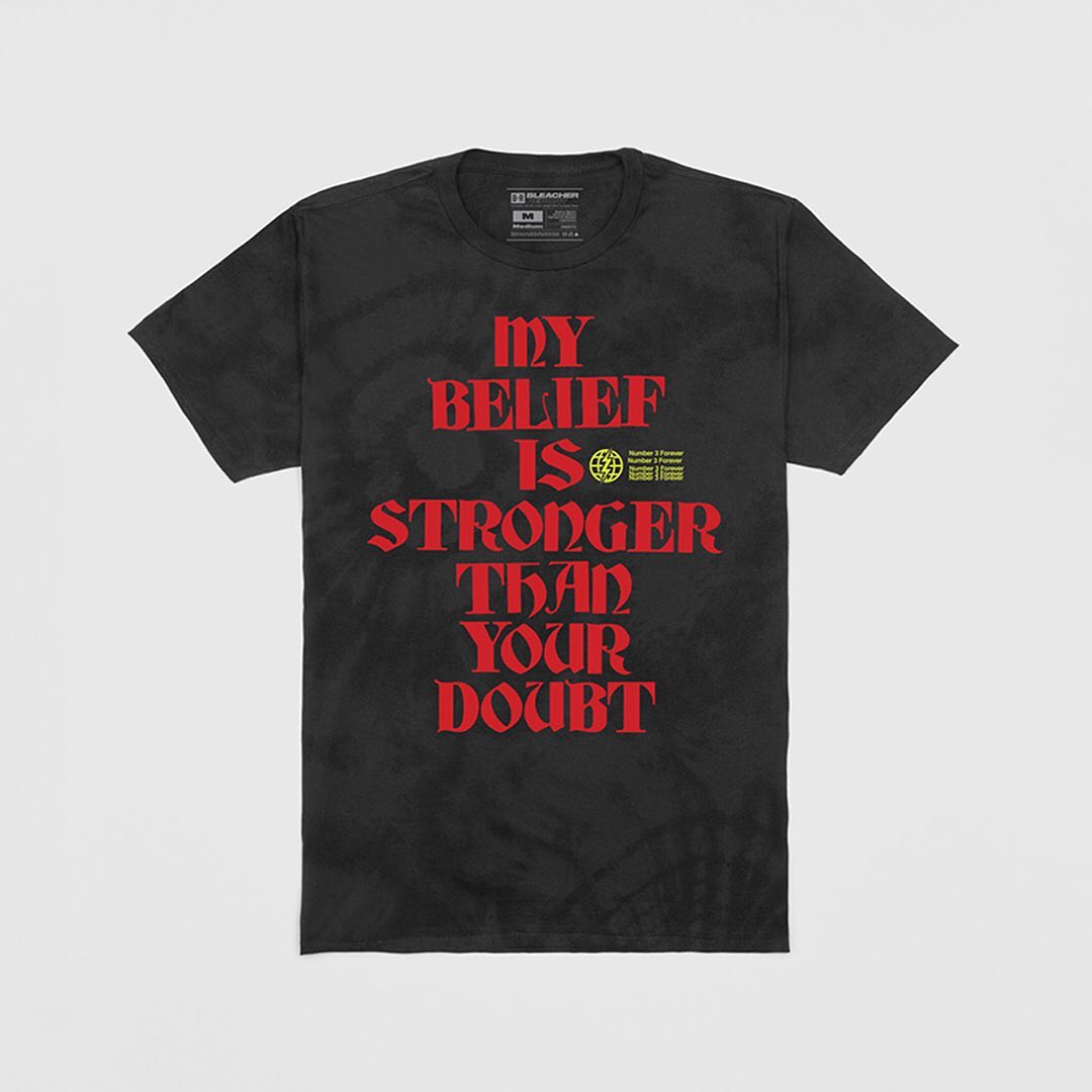 这波服饰包含帽衫、长短 T 恤和帽子,印有 “MY BELIEF IS STRONGER THAN YOUR DOUBT” 的励志话语,表达无惧质疑的态度,还印上了自己的电话号码。