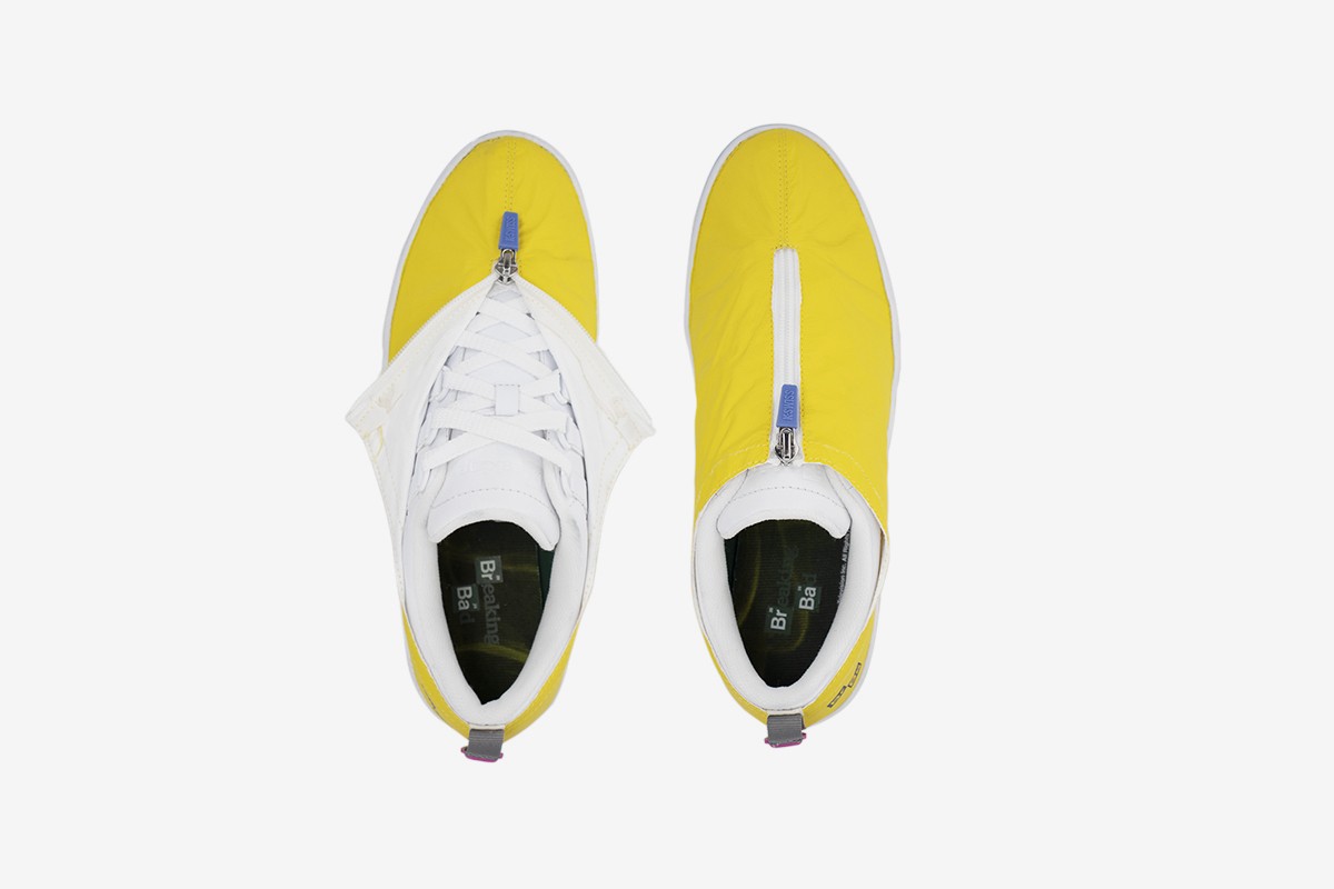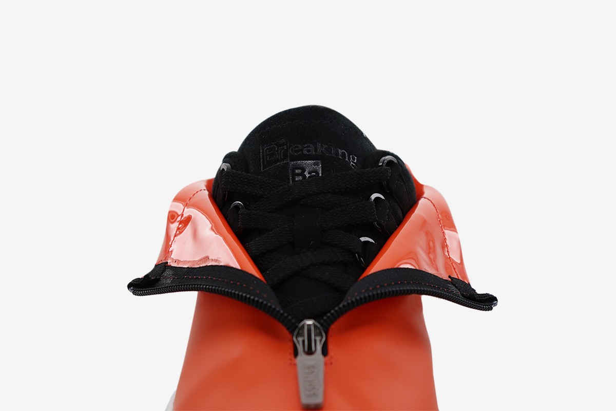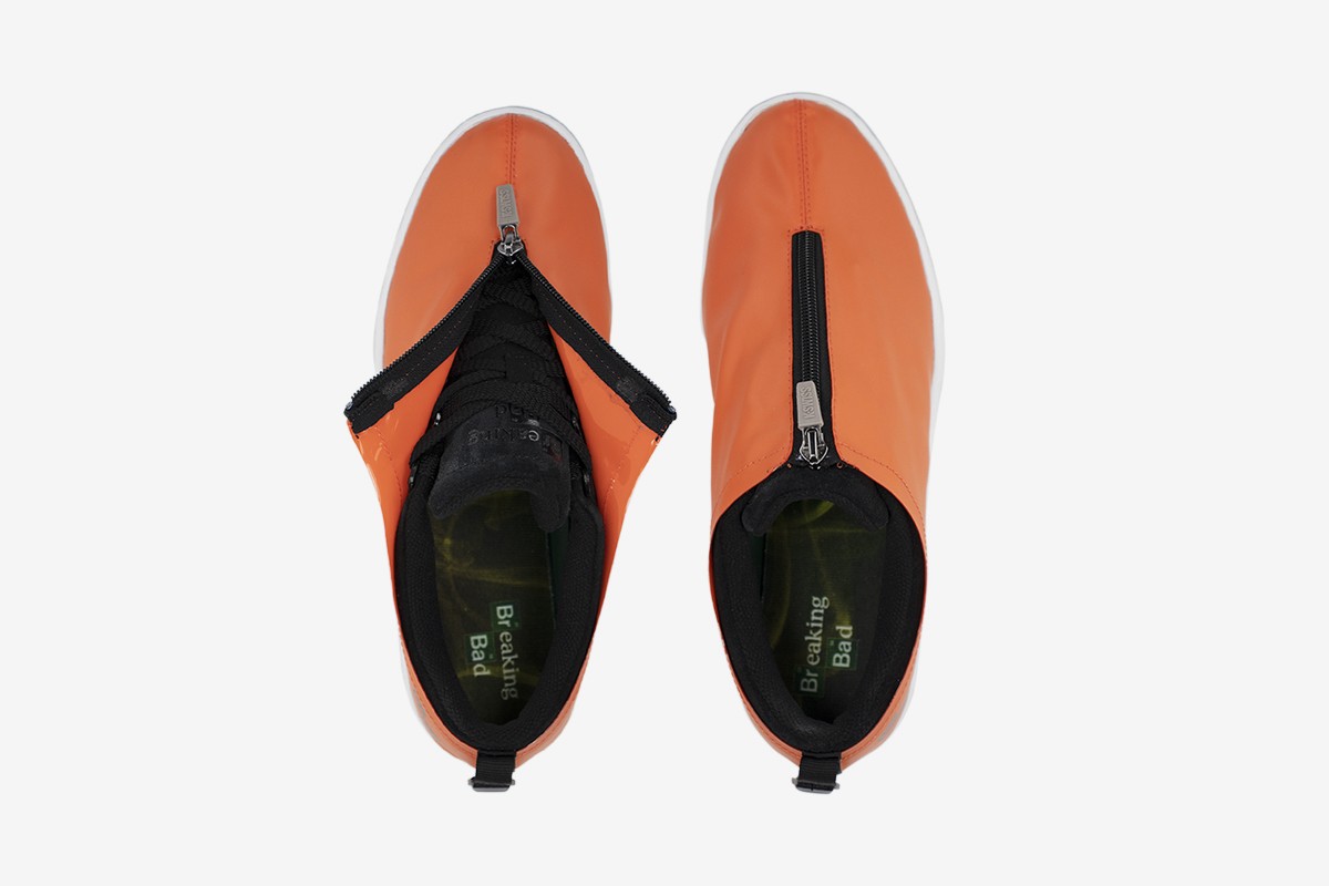 设计采用双层鞋面,两款配色分别使用黄色和橙色的外层鞋面包裹,内层鞋面则是白色与黑色皮革材质,拉链与后跟等细节都加入《绝命毒师》元素。