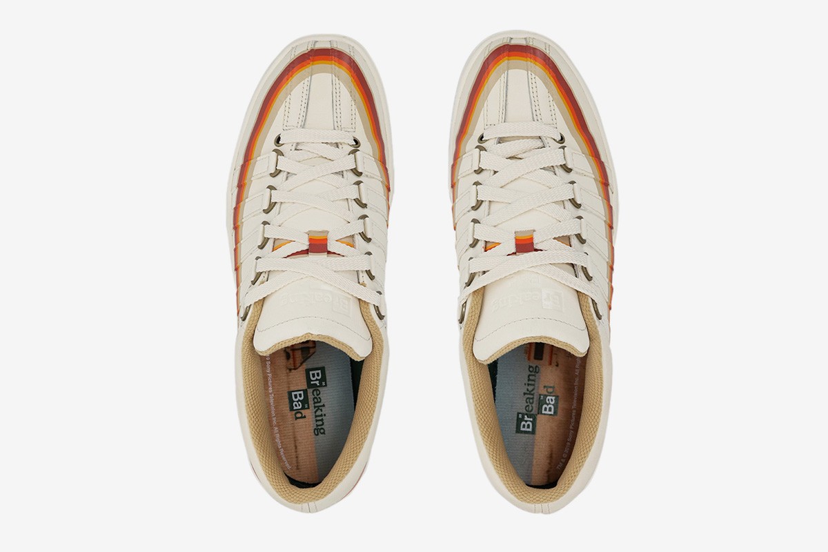 另一双配色则以剧中第一次制毒的房车为灵感,乳白色鞋面搭配橘红色过渡的条状点缀,鞋垫上印有剧照。