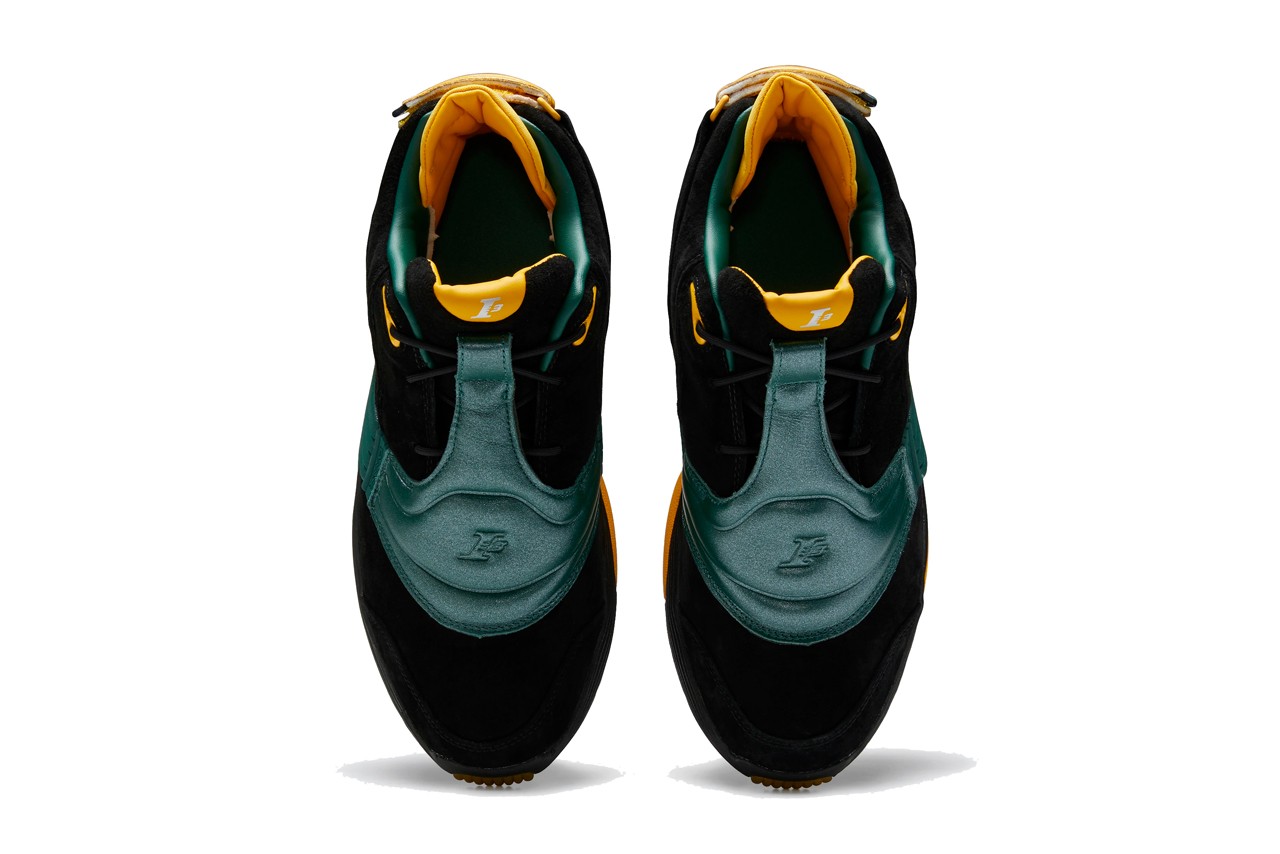 这双鞋以学校队服标志性的墨绿色搭配黑色呈现,鞋领、外底黄色点缀,整体风格复古气息浓郁。