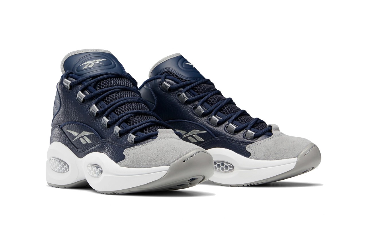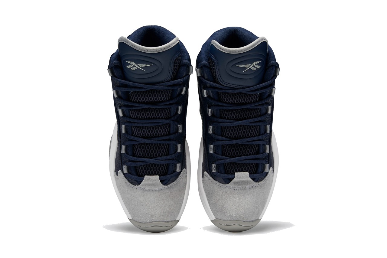 除此之外,同期还将发售 Question Mid “Hoyas”大学配色,以乔治城标志性的海军蓝、灰、白呈现,中底蜂窝气垫清晰可见。