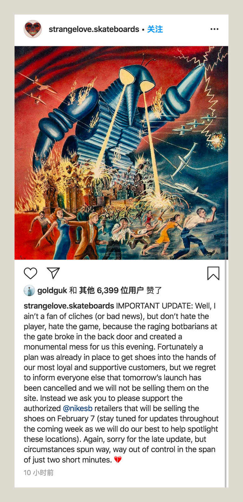 除此之外,该鞋款还拥有一版特殊鞋盒版,但因为 StrangeLove 店铺主理人不满机器人的扫货行为,从而取消了线上的特殊鞋盒发售。