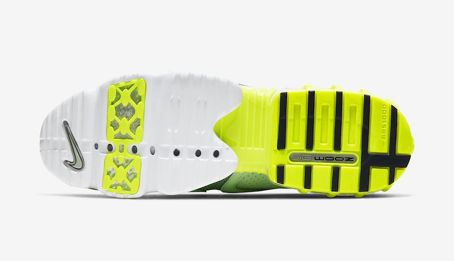 侧身以气泡样式的 Swoosh Logo 点缀,外加荧光绿色足弓及后跟气垫装饰。