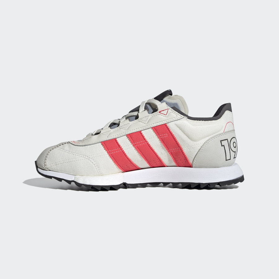 鞋头带有复古的跑鞋包头,侧身暗红色三道杠装饰。