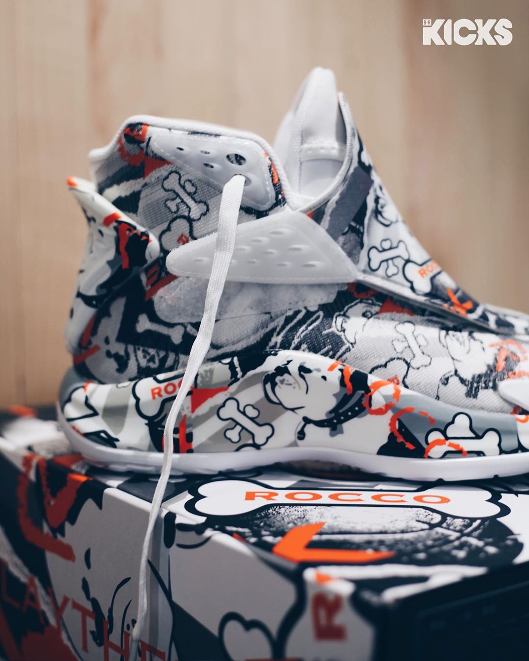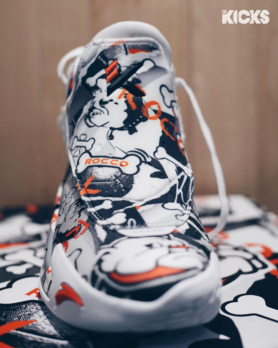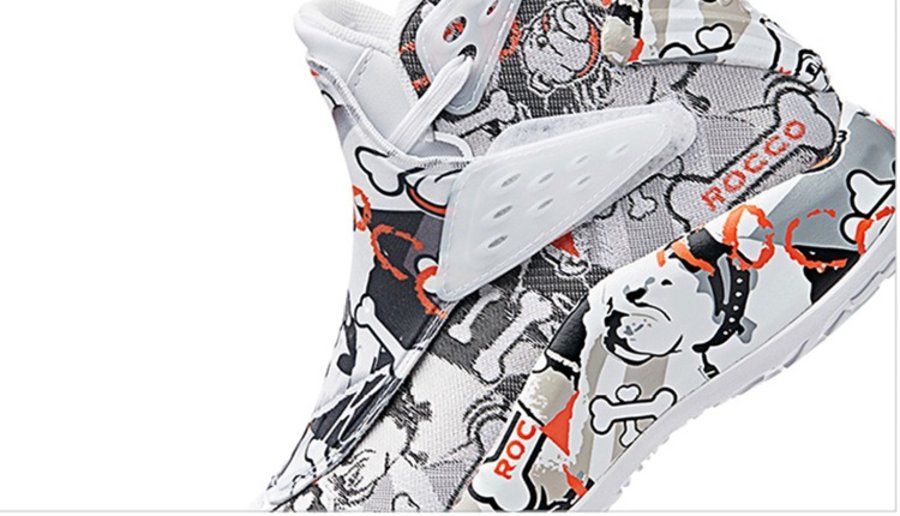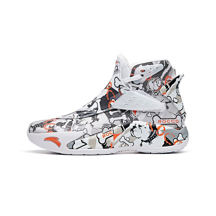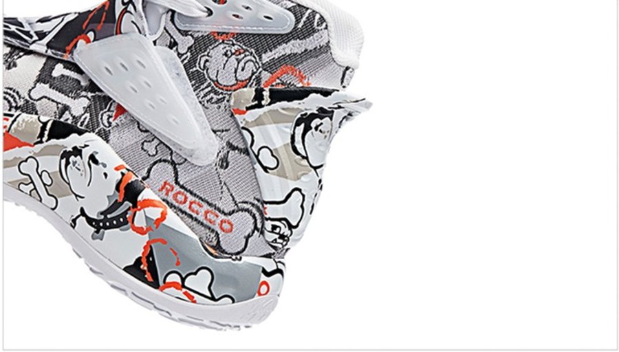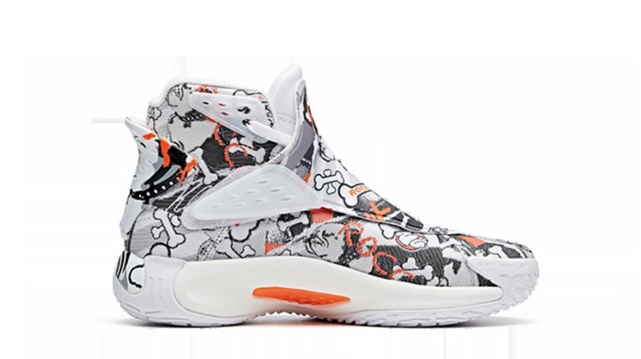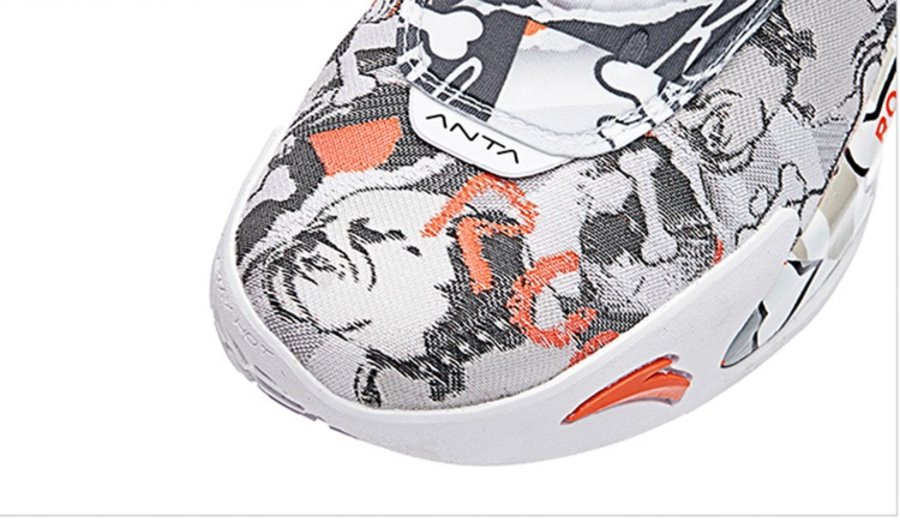 说回球鞋本身,整双鞋在 ANTA KT5 的鞋型基础上,采用白色作为底色,同时黑色涂鸦呈现出 Rocco 以及骨头的卡通形象,橙色细节的点缀为整双鞋注入活力。