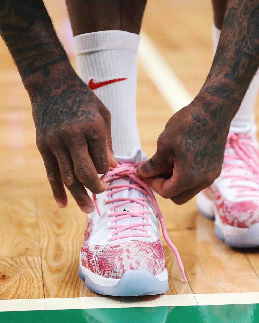 被球迷亲切称呼为 NBA 鞋王的 P.J. 塔克最近又上脚了一双天价狠货 —— 粉色蛇纹 Air Jordan 11 High PE。